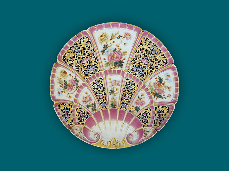 Exponatul lunii februarie este Farfuria parietală decorativă (diametrul 49 cm) realizată în atelierele de ceramică din Zsolnay (Ungaria), o piesă realizată industrial, în serie mică. Deși realizate în serie, aceste farfurii aduc în prim-plan eleganța și calitatea pieselor de artă decorativă unicat, de mare rafinament. În aceste piese de ceramică decorativă se împletesc materialul ceramic cu modelajul rafinat, traforurile decorative ritmate și tehnicile de emailare în tehnica eozină, care conferă luciri iridiscente și un luciu metalic unic.